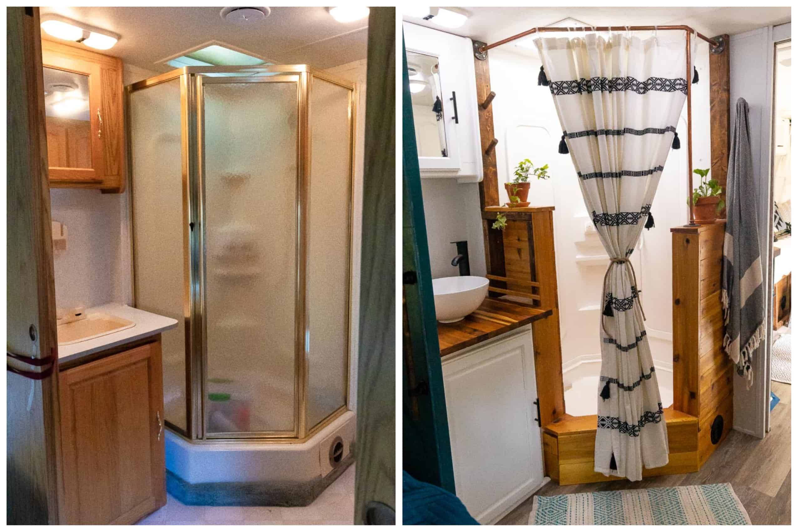 Trailer Bathroom Remodel - Travel Trailer Bathroom Remodel Ideas Rv Obsession / Jul 29, 2021 · this bathroom remodel from lee and candance rutter is a great example of how impactful a small change can be, they left the sink and updated the top of their bathroom by taking the cabinet away and adding a peel and stick backsplash, a gold oval mirror, and new lights.. I tore out the old carpet, replaced all 17 windows, added hard wood floors, all stainless steel appliances, backsplash, new light fixtures, lots of paint, new kitchen flooring—i wanted to update it but still keep a retro feel to it. Rv bathroom remodel, rv shower remodel, rv bedroom remodel, rv kitchen remodel, rv flooring remodel, rv … Or maybe, you're unsatisfied with how your travel trailer looks like and want to remodel your older travel trailer.decorating a travel trailer interior is fun, but can be challenging as well. We looked at several old, used rv's before we settled on the cargo trailer idea. Oct 28, 2021 · thinking about renovating your rv?